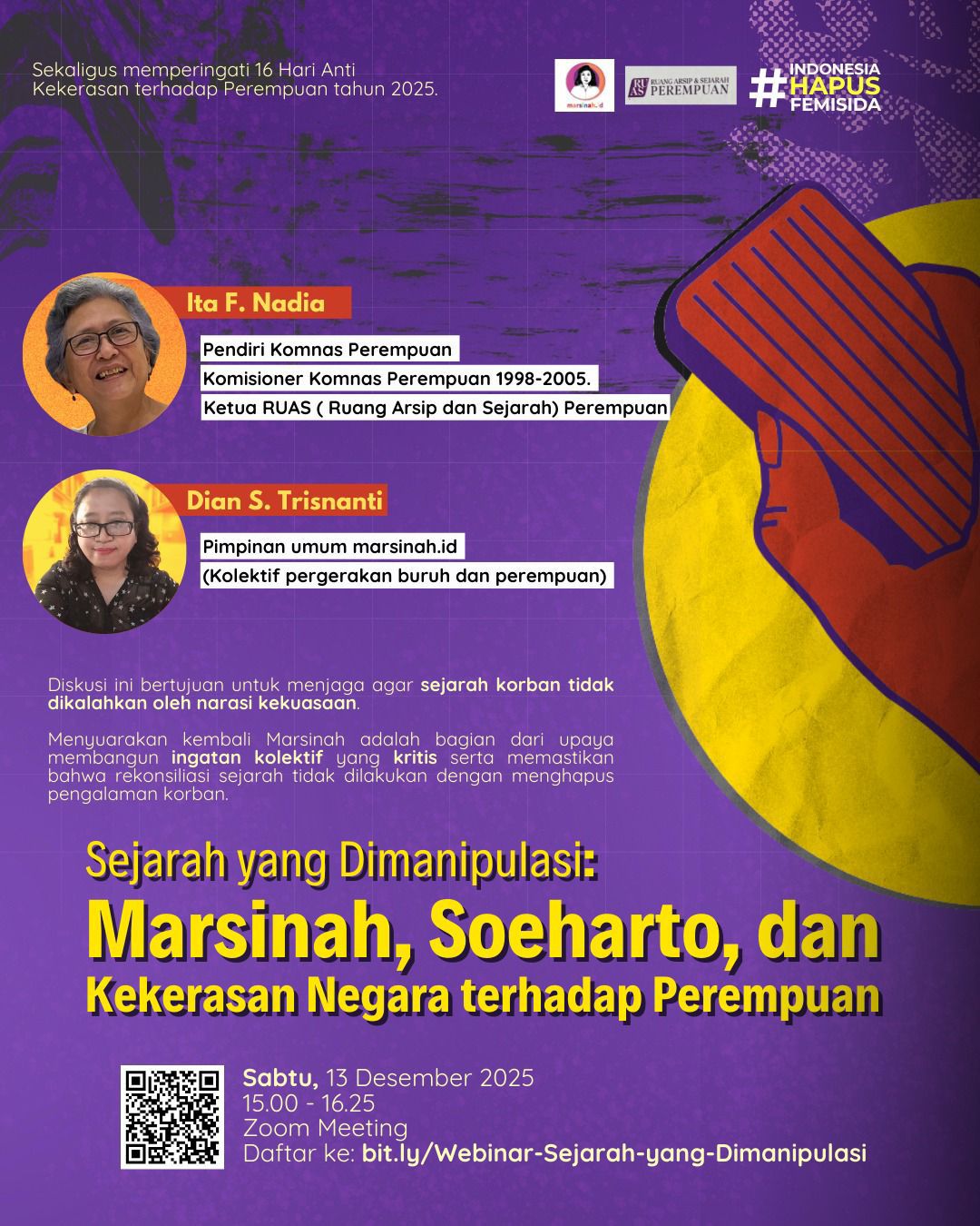 Webinar yang diselenggarakan dalam rangka memperingati 16 Hari Anti Kekerasan terhadap Perempuan oleh Indonesia Hapus Femisida menjadi ruang penting untuk merefleksikan kembali bagaimana sejarah, kekuasaan, dan kekerasan berbasis gender saling berkelindan dalam perjalanan bangsa, khususnya melalui representasi atas kasus Marsinah yang selama ini seringkali direduksi menjadi simbol semata. Diskusi ini bertujuan untuk mengajak peserta keluar dari cara pandang sejarah yang statis dan normatif, serta melihatnya sebagai produk tafsir yang dipengaruhi oleh relasi kuasa, kepentingan politik, dan proses seleksi terhadap ingatan. Dengan demikian, sejarah diposisikan bukan sebagai narasi beku yang selesai dihafalkan, ataupun hanya sekedar sistem pendidikan, melainkan sebagai arena perdebatan yang menentukan siapa yang diingat dan siapa yang disenyapkan.